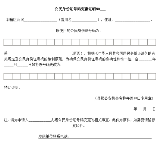 (4)如果身份证号变更,需提交如下格式的公民身份证号码变更证明,证明需盖县级公安机关户口专用章。