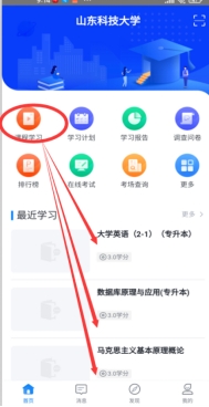 (2)集体选开课完成后,进入“首页”,即可看到本学期所有课程,点击课程名下的“课程学习”,即可在线学习。