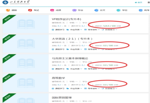 2.在线学习成绩占总成绩的30%,学习时长要求满500分钟由系统自动记录成绩30分,并在期末总成绩汇算时自动计入。学习时长包括视频课件学习,各类教学资源(教学大纲、导学计划、复习思考题等)学习、在线听课学习等累计计算总时长。各教学点要及时督导员工参加在线学习,满足要求即可获得系统自动记录的30分。